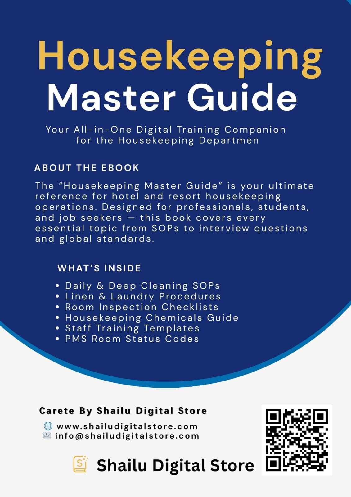 This Book is a complete housekeeping operations manual designed for hotels, resorts, cruise ships, and luxury properties. It contains 55+ Standard Operating Procedures (SOPs) covering guest rooms, public areas, laundry, safety, supplies, staff training, and documentation – all aligned with 5-star hospitality standards.